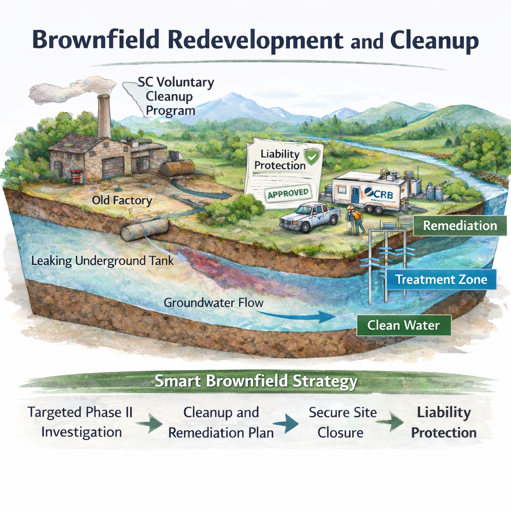 In South Carolina, many Brownfield sites can be successfully redeveloped through the state’s Voluntary Cleanup or Brownfield programs when environmental conditions are properly evaluated and managed. Early environmental due diligence helps determine eligibility, risk level, and the most efficient path forward for redevelopment.